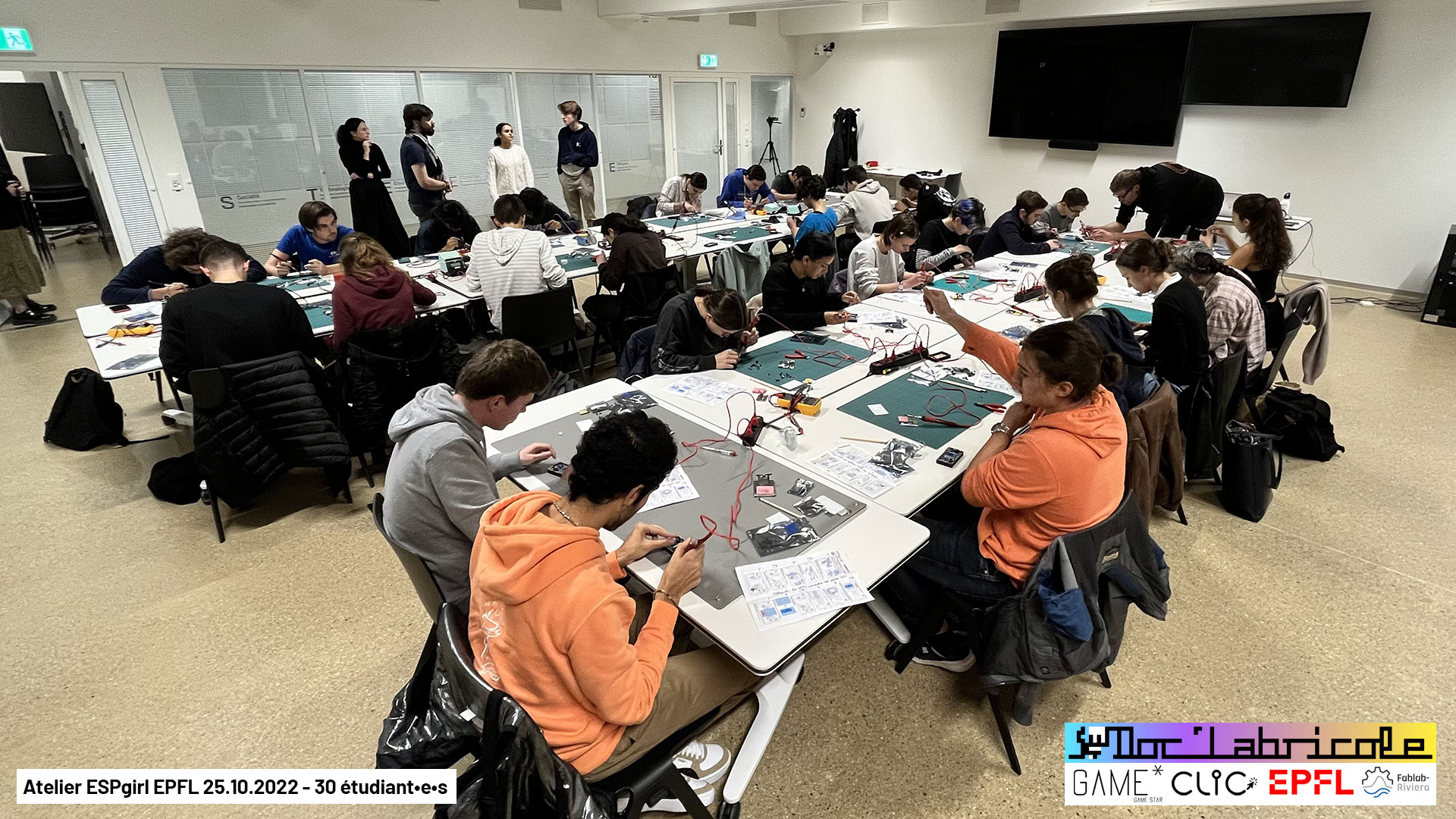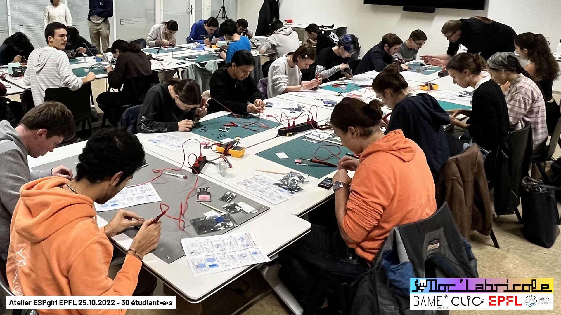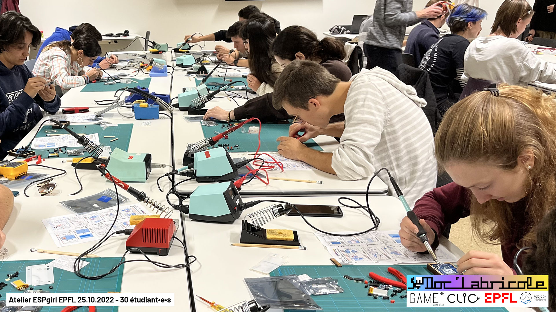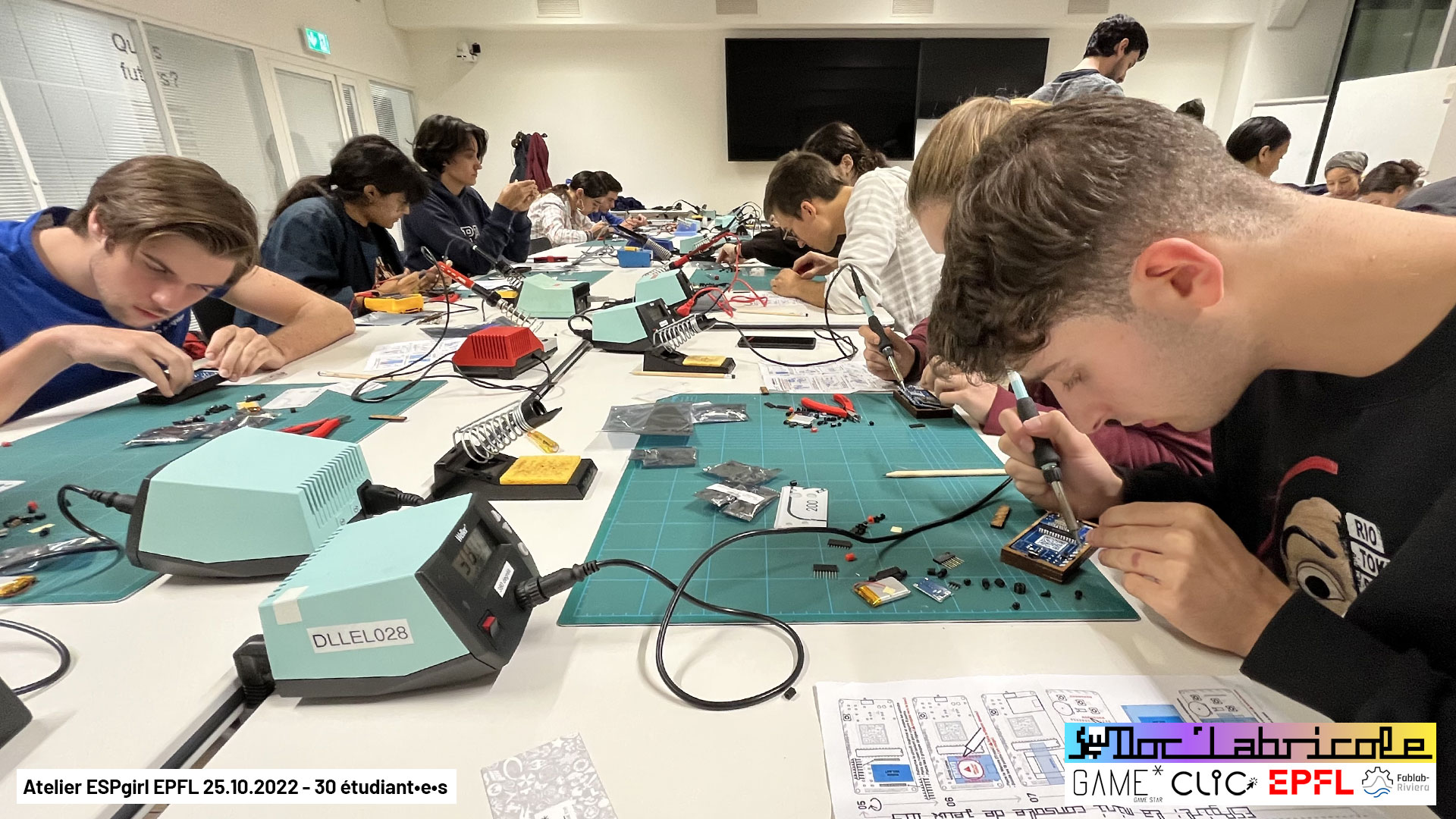 Ce sont 30 étudiant•e•s de l’EPFL qui sont venu•e•s le 25.10.2022, pour souder de toute pièce des mini consoles de jeux ESPgirl créées par Doc’Labricole (Guillaume Reymond) du Fablab-Riviera, pour cet atelier organisé par l’association estudiantine pour la promotion du jeu vidéo Game* (Clic)