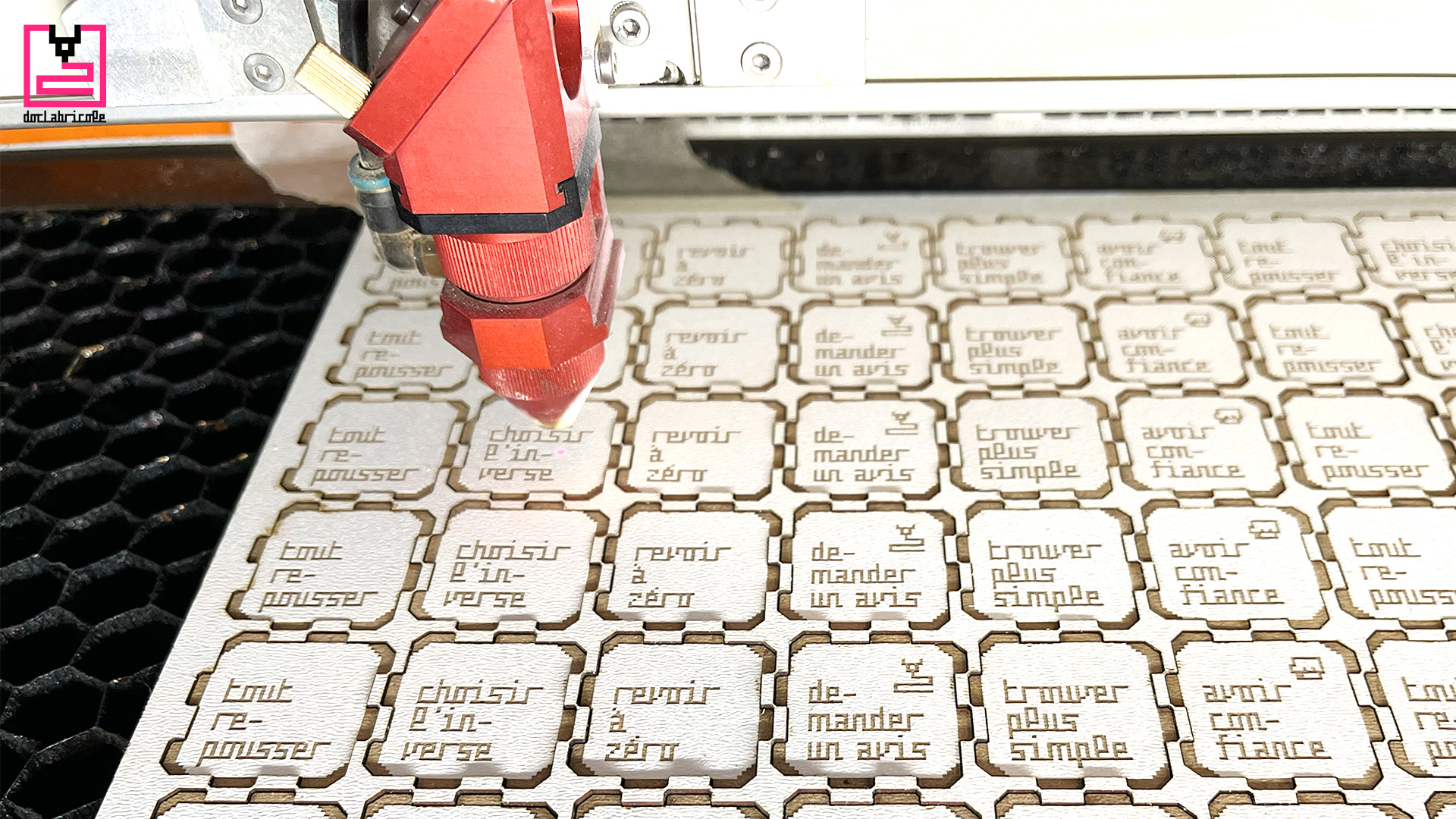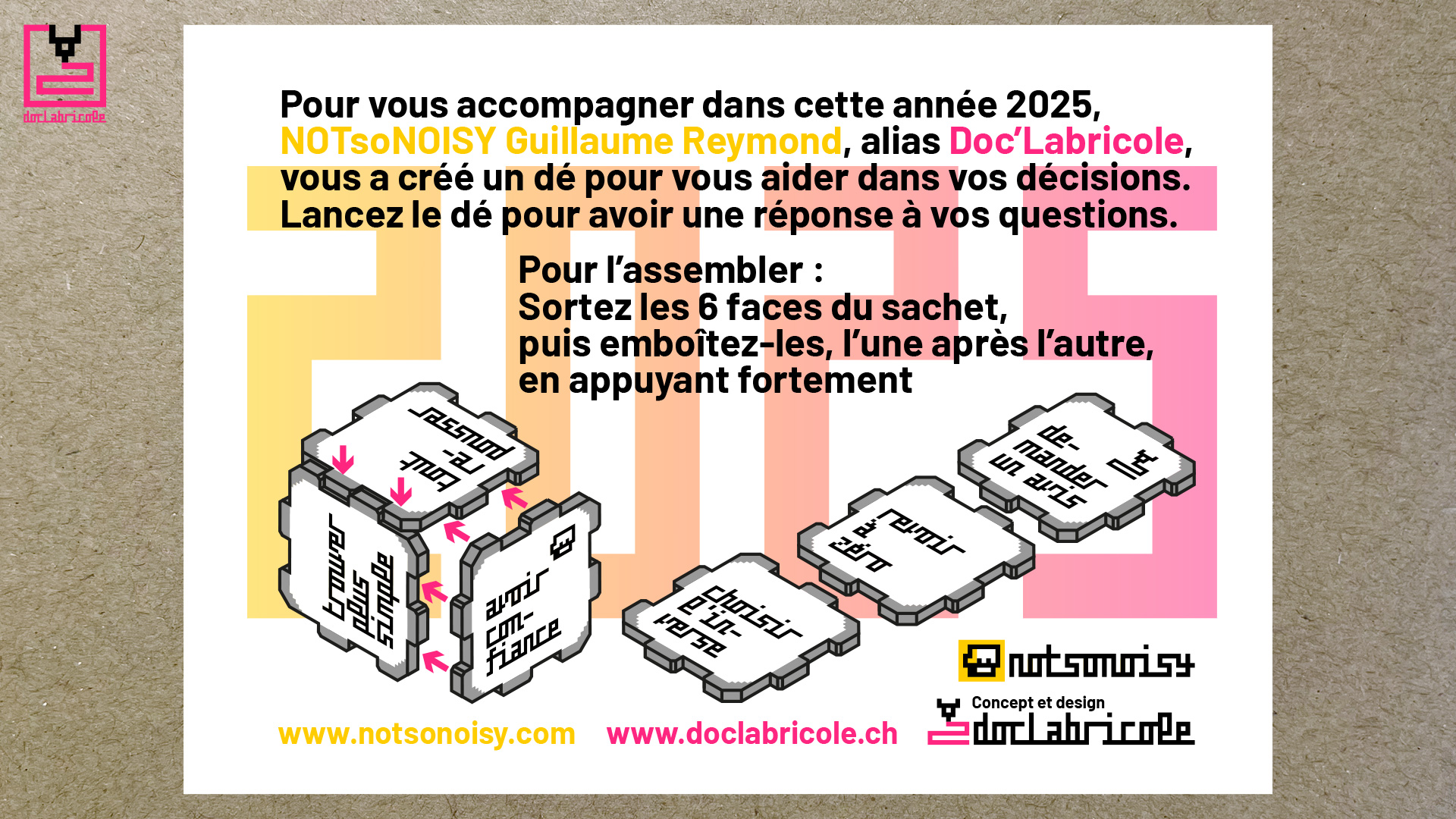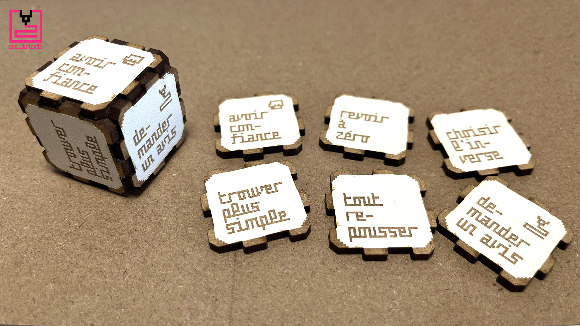 Pour accompagner ses client.es et partenaires dans cette année 2025, Doc’Labricole (NOTsoNOISY Guillaume Reymond) a créé un « dé de décision » en découpe laser. Les 6 pièces ont été gravées et découpées au laser au Fablab-Riviera dans du bois MDF laminé blanc de 3mm. Ces pièces s’emboîtent, une à une, pour former un dé cubique, sans nécessiter de colle. Il suffit ensuite de lancer ce dé, pour s’aider à prendre une décision.